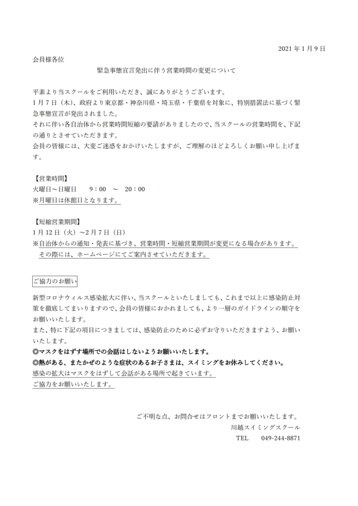 首都圏1都3県への緊急事態宣言発令に伴う対応について
