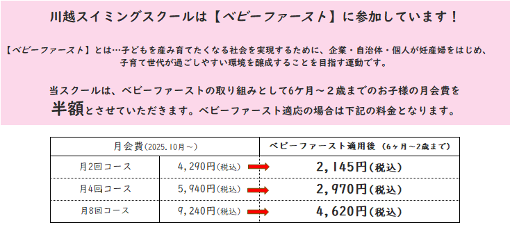 | 親子で一緒にお入りいただき、ママやパパが直接お子様に水の楽しさを伝えていきます。お子様と成長する喜びを分かち合い、親子のスキンシップを図ります。 |