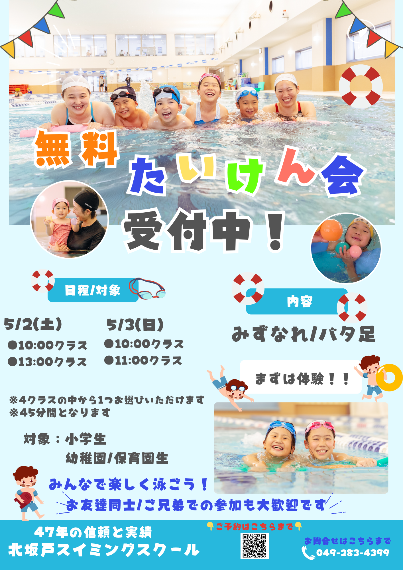 GW限定!!スイミング無料体験会お知らせ 申込はこちらから↓↓ https://scr.buscatch.net/application/?f=kitasakad … 詳しく見る » 2026.4.22 | コメントはまだありません | Category: お知らせ