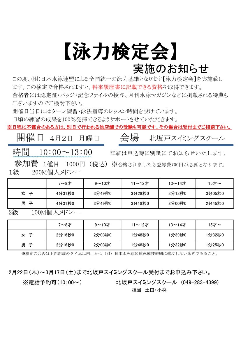 泳力検定会のご案内