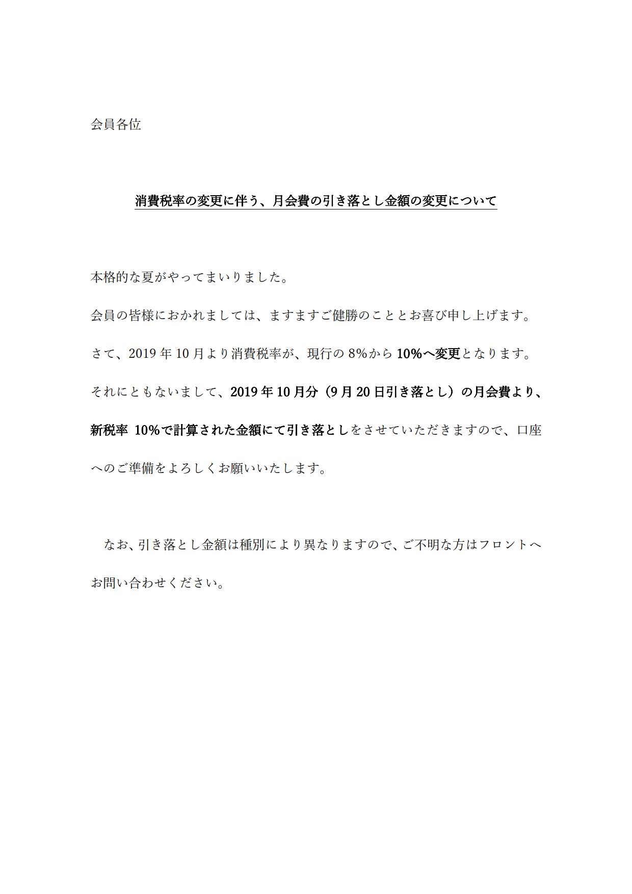 消費税率の変更に伴う、月会費の引き落とし金額の変更について