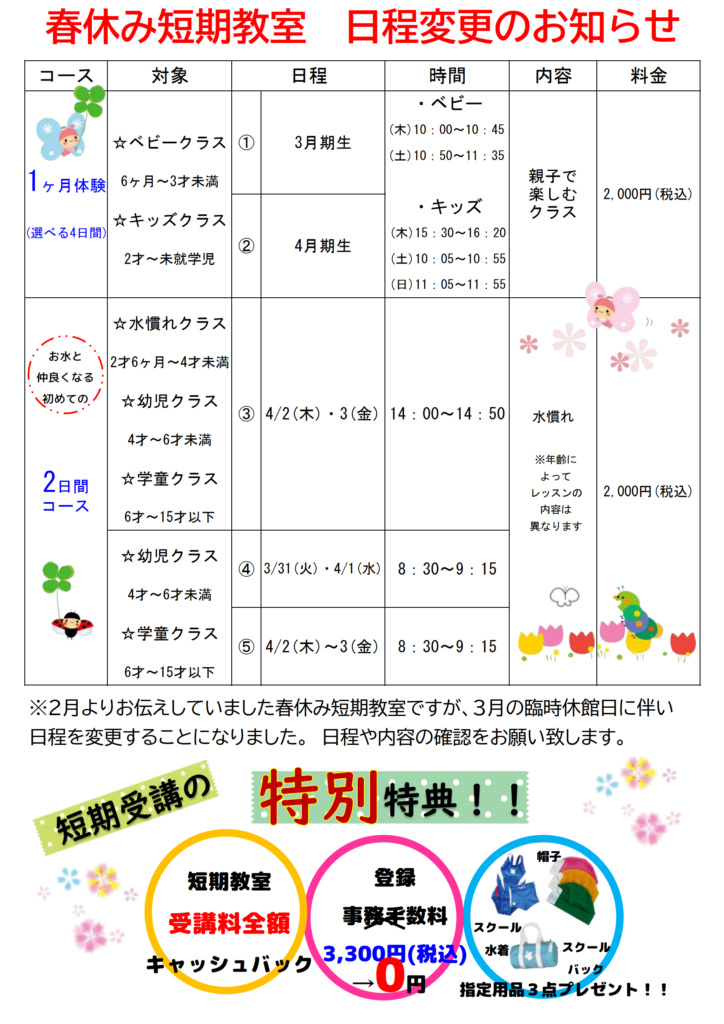 春休み短期教室、日程変更のお知らせ