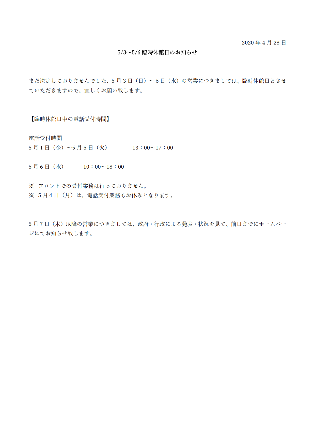 5/3~5/6臨時休館日のお知らせ