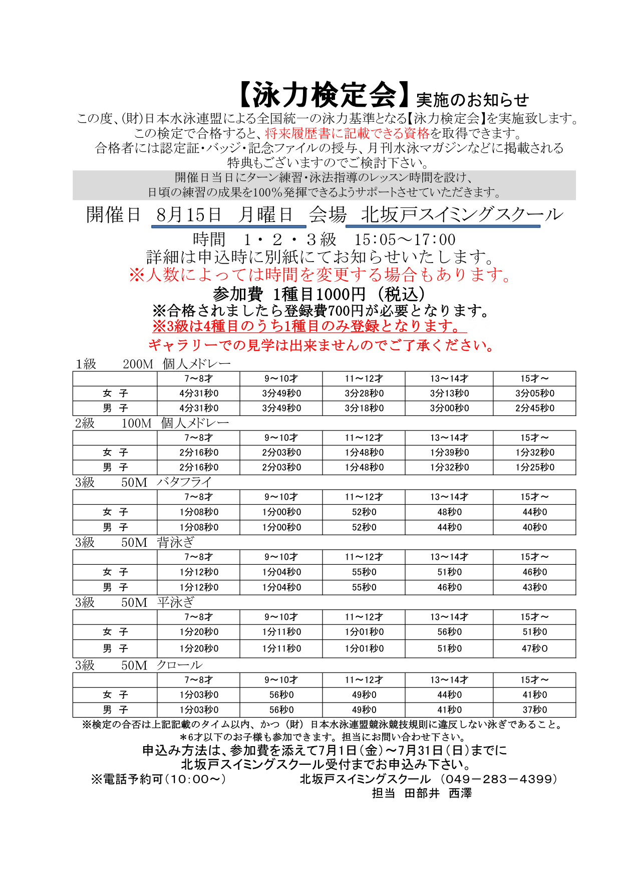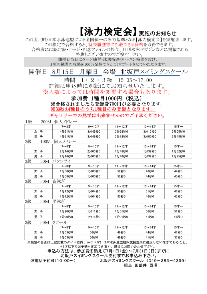 泳力検定会のお知らせ